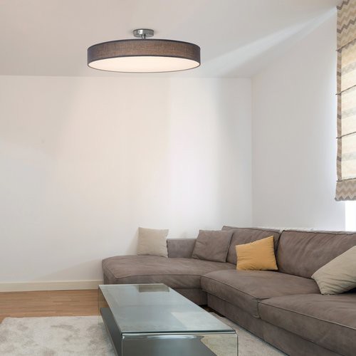 A nagyméretű, kerek Helios mennyezeti lámpa nevéhez méltóan úgy ragyogja be meleg fehér fényével a szobát, mint a Nap. A fémből készült szatinkróm és fehér színű lámpát körben szürke színű szövet borítja. A Helios csodásan mutat modern nappalinkban vagy akár hálószobánk mennyezetén. Beépített, energiatakarékos LED fényforrása 36 W teljesítménnyel bír, fényereje 2300 lumen, élettartama pedig lenyűgöző, mintegy 30 000 óra. Az A energiaosztályba tartozó fényforrás színhőmérséklete 3000 K, ennek megfelelően meleg fehér fényt sugároz. A lámpa fali kapcsoló segítségével három lépésben dimmelhető, azaz fényereje igény szerint változtatható. A Helios mennyezeti lámpa átmérője 500 mm, mennyezettől való távolsága 155 mm. Erre a modellre 5 év garanciát vállalunk.