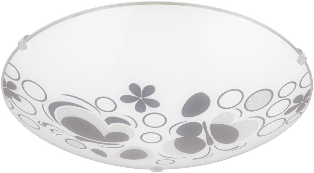 25 cm átmérőjű, hagyományos megjelenésű mennyezeti lámpa, fém és műanyag szerkezettel, virág mintás üveg lámpabúrával, fehér alszínben. E27-es foglalatú, maximum 60W teljesítményű, halogén vagy LED fényforrással is használható.