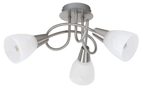 A Jenna hármas mennyezeti lámpát a hagyományos stílus kedvelőinek ajánljuk. Az energiatakarékos fényforrásokkal használható modell a szatin króm lámpatestet alabástrom üveg búrával ötvözi, különlegességét a csavart dizájn adja. A mennyezeti lámpa átmérője 360 mm, mennyezettől mért távolsága 210 mm. A Jenna mutatós darabja lehet nappalink vagy hálószobánk berendezésének. A lámpa 3 db, legfeljebb 40 W teljesítményű izzóval használható, a foglalat típusa E14. A kellemes, meghitt hangulat megteremtéséhez válasszunk hozzá meleg fehér színű izzókat. Ezt a modellt fényforrás nélkül szállítjuk.