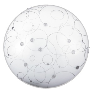 50 cm átmérőjű, modern megjelenésű mennyezeti lámpa, fém és műanyag szerkezettel, kiváló minőségű, 3D hatású, üveggyöngyözött, fehér alapszínű, mintás lámpabúrával. 3 db E27-es foglalatában maximum 3x 40W teljesítményű, halogén vagy LED fényforrásokkal is használható. Kialakításának köszönhetően a fényforrások cseréje, illetve a lámpatest tisztítása gyorsan és egyszerűen elvégezhető.