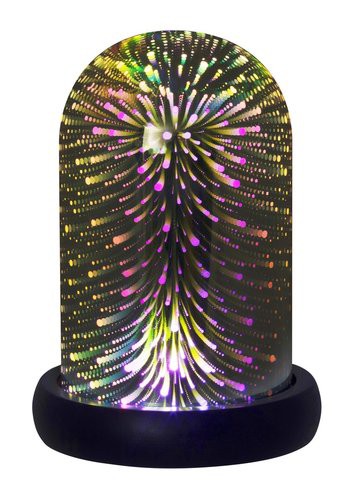 Asztali dekor lámpa beépített energiatakarékos LED izzóval, színes, tükröződő felülettel. 15 cm magas és 10 cm átmérőjű, fekete és króm színű, fémből és műanyagból készített szerkezet üveg búrával, IP20-as védettséggel. A DC 4,5V-os kialakítású, 3 db AAA elemmel működtethető lámpatest, teljesítménye 0,5W, amelyhez a dekorációs fény alapjaként 100 lumen fényerő társul. Színhőmérséklete hidegfehér (6500 Kelvin). A lámpatestben a izzó nem cserélhető, illetve az elemek nem tartozékok.