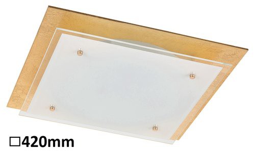 Minimalista stílusú, modern megjelenésű mennyezeti lámpa beépített energiatakarékos LED fényforrással. 42 x 42 cm széles, arany fólia és fehér színkombinációjú fém és üveg szerkezet. A beépített LED fényforrás A+ energiaosztály besorolású és 24W teljesítmény mellett 1920 lumenes fényerőt, valamint 3000 Kelvines, természetes fehér színű fényt biztosít. 5 év garanciával. A lámpatestben a fényforrás nem cserélhető.