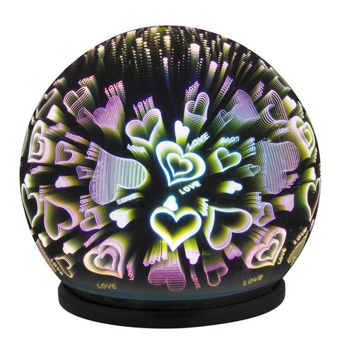 Asztali dekor lámpa beépített energiatakarékos LED izzóval, színes, tükröződő felülettel. 10 cm magas és 10 cm átmérőjű, fekete és króm színű, fémből és műanyagból készített szerkezet üveg búrával, IP20-as védettséggel. A DC 3V-os kialakítású, 2 db AA elemmel működtethető lámpatest, teljesítménye 0,5W, amelyhez a dekorációs fény alapjaként 50 lumen fényerő társul. Színhőmérséklete hidegfehér (6500 Kelvin). A lámpatestben a izzó nem cserélhető, illetve az elemek nem tartozékok.