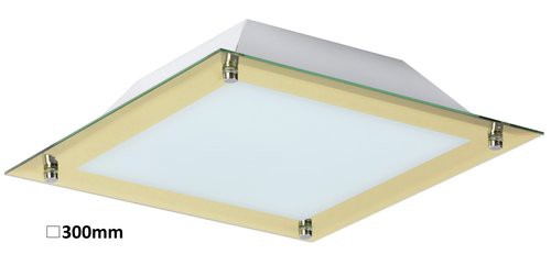 Minimalista stílusú, modern megjelenésű mennyezeti lámpa beépített energiatakarékos LED fényforrással. 30 x 30 cm széles, fém és üveg kombinációjú szerkezet arany színnel. A beépített LED fényforrás A+ energiaosztály besorolású és 12W teljesítmény mellett 960 lumenes fényerőt, valamint 3000 Kelvines, melegfehér színű fényt biztosít. 5 év garanciával. A lámpatestben a fényforrás nem cserélhető.