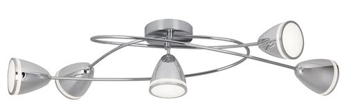 Modern megjelenésű mennyezeti lámpa beépített energiatakarékos LED izzókkal. A spotlámpa 77 cm széles, króm színű, fém és műanyag kombinációjú lámpatest és lámpabúrák, IP20-as védettséggel. A beépített LED izzók A+ energiaosztály besorolású és 5x 4W teljesítmény mellett 360 lumen fényerőt, valamint 4000 Kelvines, természetes fehér színű fényt biztosítanak. A lámpatestbe beépített izzók nem cserélhetők. 5 év garanciával!