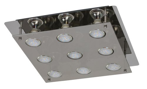 A 9 db LED fényforrással szerelt Naomi szögletes mennyezeti lámpa méretével és fényerejével egyaránt lenyűgöző hatást kelt. A 380×380 mm-es, füstszínű üveg és króm kombinációjával készült, egyedi formatervezésű lámpát elsősorban a nappaliba vagy az étkezőbe ajánljuk. A meleg fehér fényt kibocsátó LED fényforrások cserélhetők, egyenként 5 W energiát fogyasztanak, fényerejük 400 lumen, színhőmérsékletük 3000 K, névleges élettartamuk pedig 20 000 óra. A GU10-es típusú foglalatokba 9 db, egyenként maximum 15 W teljesítményű LED fényforrás helyezhető be. A lámpa nettó súlya 2,75 kg.