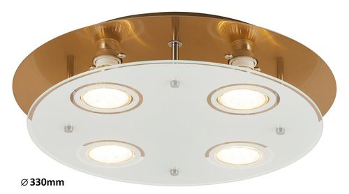 Modern megjelenésű mennyezeti lámpa energiatakarékos LED fényforrásokkal. 33 cm átmérőjű, fém és üveg kombinációjú szerkezet bronz színben. A lámpatestben elhelyezett LED fényforrások A+ energiaosztály besorolású és 4x 5W teljesítmény mellett 400 lumenes fényerőt, valamint 3000 Kelvines, melegfehér színű fényt biztosítanak. Fényforráscsere esetén a lámpatest GU10-es foglalatkialakítású, 4x max. 15W teljesítményű, kizárólag energiatakarékos fényforrásokkal használható.