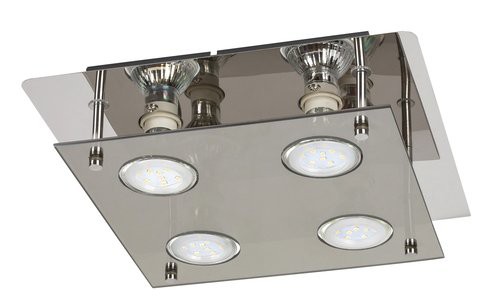 Modern és látványos: a 4 db meleg fehér fényű, cserélhető LED fényforrással szerelt Naomi mennyezeti lámpa garantáltan magára vonzza a tekinteteket. Ennél a modellnél a füstszínű üveg és króm kombinációja egyedi dizájnnal párosul. A 260×260 mm-es, szögletes mennyezeti lámpát elsősorban a nappaliba, az étkezőbe vagy a hálószobába ajánljuk. A LED fényforrások egyenként 5 W energiát fogyasztanak, fényerejük 400 lumen, színhőmérsékletük 3000 K, névleges élettartamuk mintegy 20 000 óra. A GU10-es típusú foglalatokba 4 db, egyenként maximum 15 W teljesítményű LED fényforrás helyezhető be. A lámpa nettó súlya 1,2 kg.