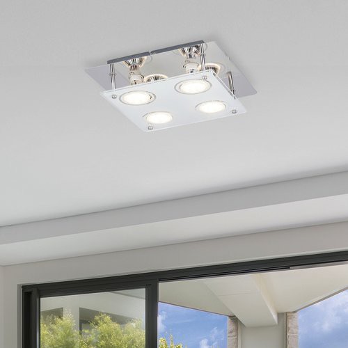Modern megjelenésű mennyezeti lámpa hozzáadott energiatakarékos LED fényforrásokkal. 26 cm széles, tükörkróm színű fém lámpatest üveg lámpabúrával. A csomagban található LED fényforrások A+ energiaosztályú besorolás és 4x 5W teljesítmény mellett 400 lumenes fényerőt, valamint 3000 Kelvines, melegfehér színű fényt biztosítanak. Izzócsere esetén a lámpatest GU10-es foglalatú, max. 4x 15W teljesítményű, kizárólag energiatakarékos fényforrásokkal használható.