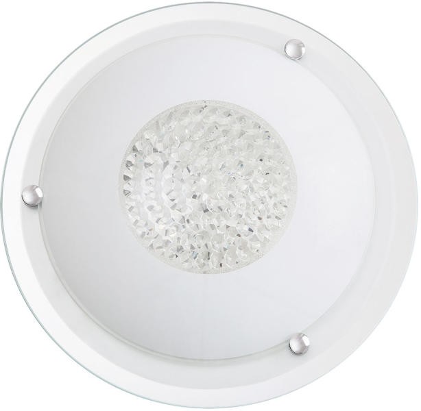 Exkluzív megjelenésű mennyezeti lámpa 3 db foglalattal. 42 cm átmérőjű, fémből készített lámpatest fehér színű üveg lámpabúrával, áttetsző üvegkristály díszítéssel. A lámpatest E27-es foglalatú, max. 3x 40W teljesítményű energiatakarékos fényforrásokkal is használható. Kialakításának köszönhetően a fényforrások cseréje és a lámpatest tisztítása könnyen és egyszerűen elvégezhető.