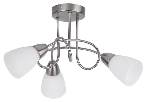 Modern megjelenésű mennyezeti lámpa 3 db foglalattal. 42 cm átmérőjű, 28 cm lenyúlású, szatin króm színű, fémből készített lámpatest és üveg lámpabúrák. A lámpatest E-14-es foglalatú, max. 3x 40W teljesítményű energiatakarékos fényforrásokkal is használható.