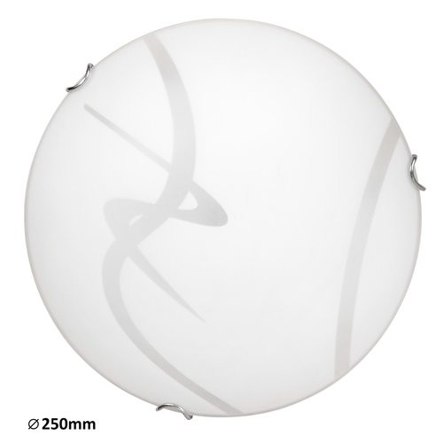 Időtlen megjelenésű mennyezeti lámpa beépített energiatakarékos LED fényforrással. Fém, üveg és műanyag kombinációjú szerkezet 25 cm átmérőjű, fehér alapszínű, mintás lámpabúrával és króm színű rögzítőkörmökkel. A beépített LED fényforrás A+ energiaosztály besorolású és 12W teljesítmény mellett 960 lumenes fényerőt, továbbá 3000 Kelvines, melegfehér színű fényt ad. 5 év garanciával. A lámpatestben a fényforrás nem cserélhető.