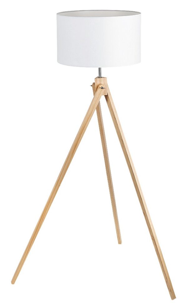 Skandináv stílusú, háromlábú állólámpa 1 db foglalattal, vezetékes kapcsolóval. 134 cm magas, bükk színű fából és króm színű fémből készített szerkezet 40 cm átmérőjű, fehér színű textil lámpabúrával. Az állólámpa E27-es foglalatú, max. 60W teljesítményű energiatakarékos fényforrással is használható.